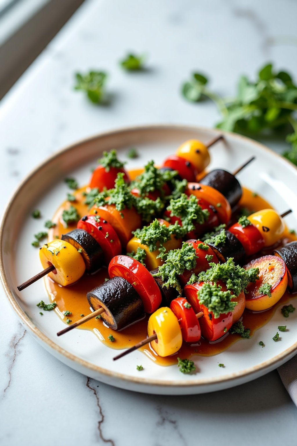 Smoky Grilled Vegetable Kabobs with Chimichurri on ceramic dish, 45-degree angle